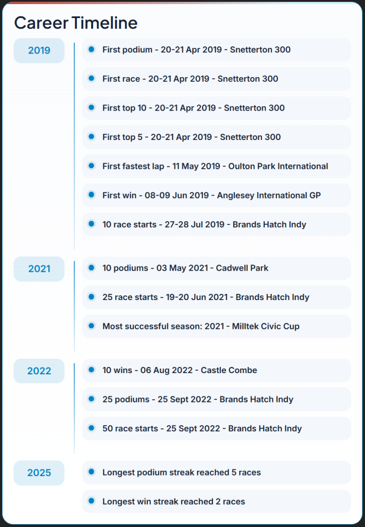 Follow key milestones such as first race, first top 10, first podium, first win, fastest laps, and major career landmarks.