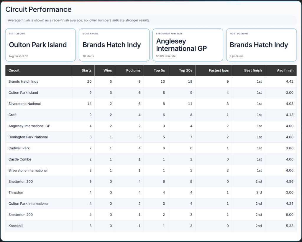 Find out where a driver performs best with track-by-track stats covering starts, wins, podiums, and fastest laps.