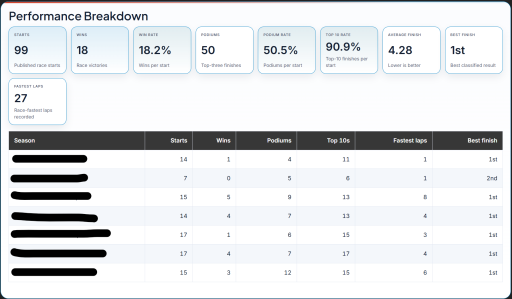 Racing Insight Pro gives you deeper driver data, richer profile features, and more detailed performance breakdowns across the series and seasons we cover.