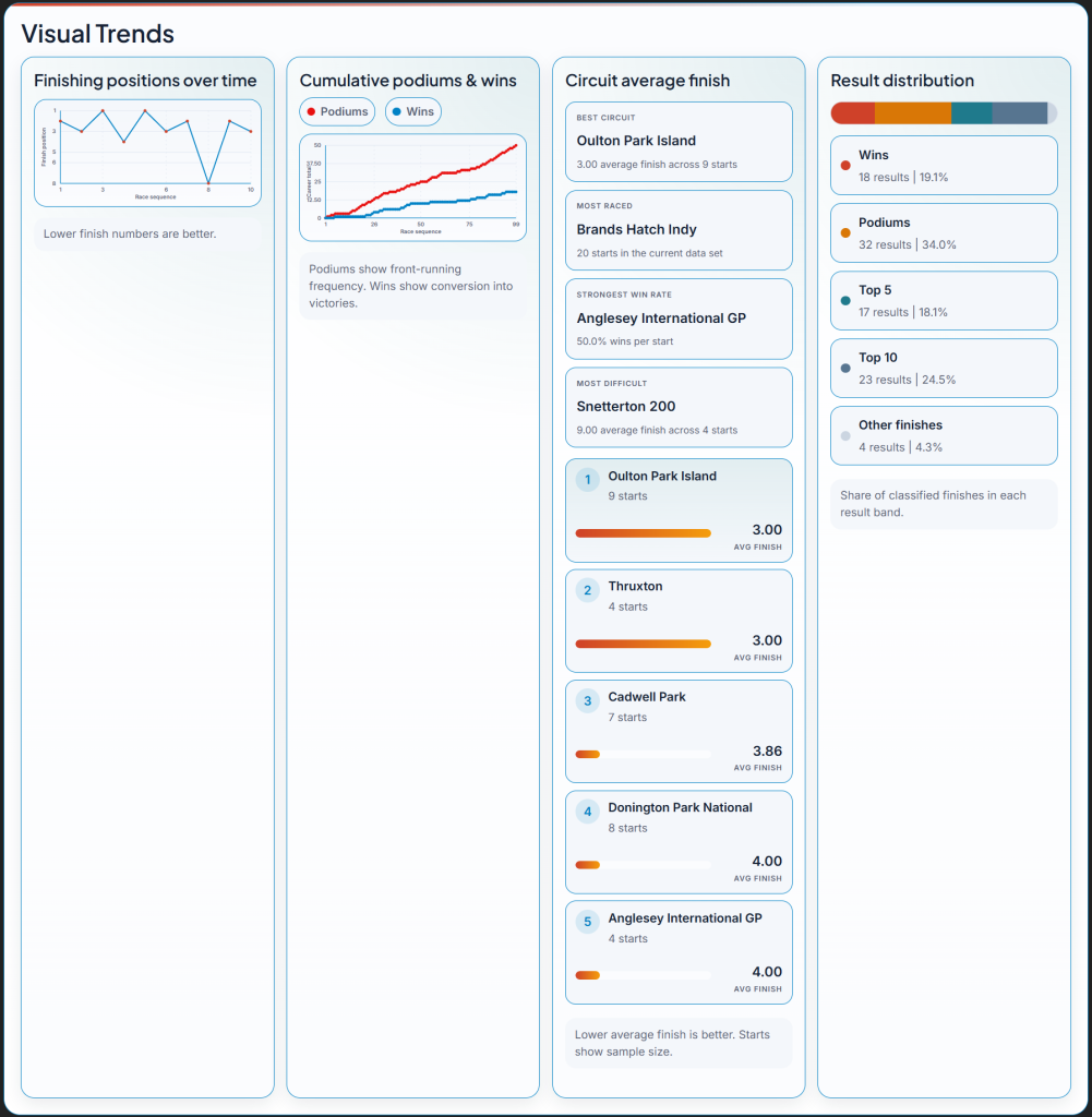 Finishing positions over time, Cumulative podiums & wins, Circuit average finish & Result distribution.